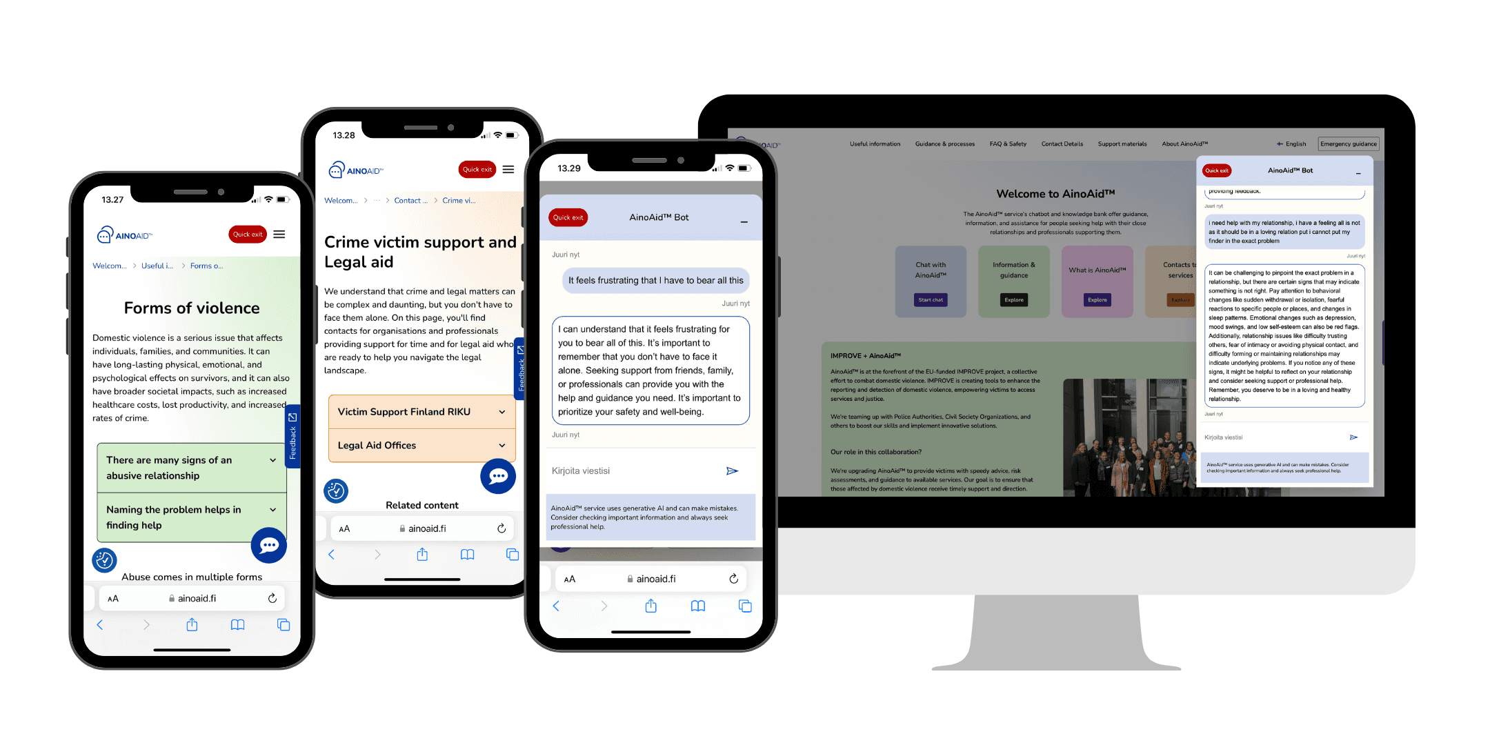 AinoAid™ can help and support a person who is exploring their situation and wondering, for example, whether their experience in the relationship is normal or whether it could be domestic violence. They can discuss their own experiences, feelings and thoughts with the chatbot or read the information they need from the knowledge base. The user can think about their own options with the chatbot, they can get information about what to consider, for example, when separating from a violent partner or what kind of help they can get from child protection services. With the help of AinoAid™, you can make a safety plan for yourself and a plan for how to break away from a violent relationship.